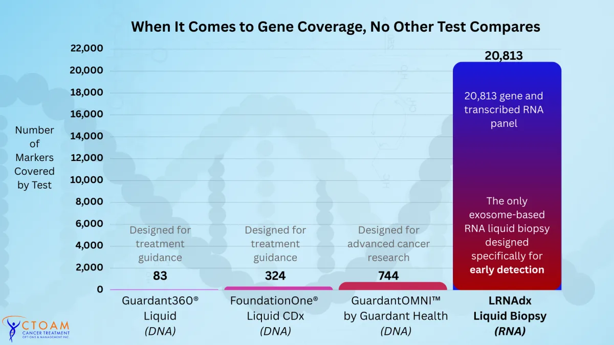 By contrast, the LRNAdx Liquid Biopsy tests for 20,813 genes and transcribed RNA sequences – almost every known molecular feature in the human body – and looks at the latest genetic and epigenetic markers for cancer.
